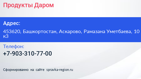 Продукты Даром по адресу 453620, Башкортостан, Аскарово, Рамазана Уметбаева, 10 к3 в дальнейшем Организация, размещена в следующих категориях: