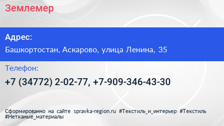Землемер по адресу Башкортостан, Аскарово, улица Ленина, 35 в дальнейшем Организация, размещена в следующих категориях: