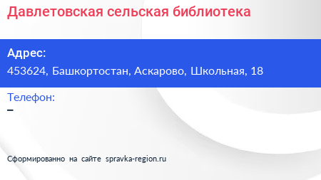 Давлетовская сельская библиотека по адресу 453624, Башкортостан, Аскарово, Школьная, 18 в дальнейшем Организация, размещена в следующих категориях: