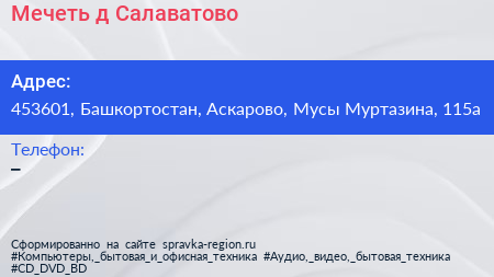 Мечеть, д. Салаватово по адресу 453601, Башкортостан, Аскарово, Мусы Муртазина, 115а в дальнейшем Организация, размещена в следующих категориях: