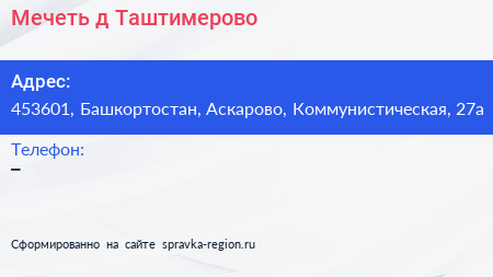 Мечеть, д. Таштимерово по адресу 453601, Башкортостан, Аскарово, Коммунистическая, 27а в дальнейшем Организация, размещена в следующих категориях: