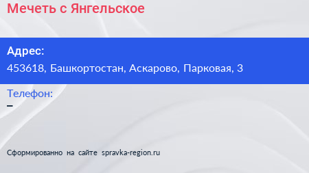 Мечеть, с. Янгельское по адресу 453618, Башкортостан, Аскарово, Парковая, 3 в дальнейшем Организация, размещена в следующих категориях: