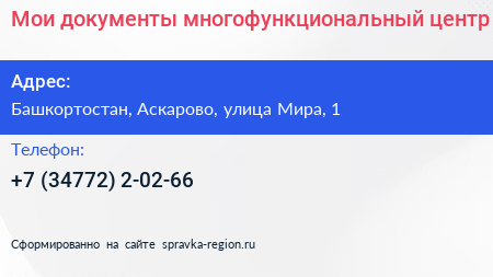 Мои документы, многофункциональный центр по адресу Башкортостан, Аскарово, улица Мира, 1 в дальнейшем Организация, размещена в следующих категориях: