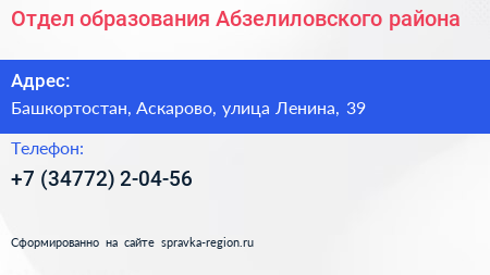 Отдел образования Абзелиловского района по адресу Башкортостан, Аскарово, улица Ленина, 39 в дальнейшем Организация, размещена в следующих категориях: