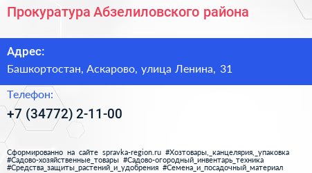 Прокуратура Абзелиловского района по адресу Башкортостан, Аскарово, улица Ленина, 31 в дальнейшем Организация, размещена в следующих категориях: