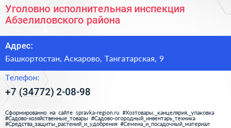 Уголовно-исполнительная инспекция Абзелиловского района по адресу Башкортостан, Аскарово, Тангатарская, 9 в дальнейшем Организация, размещена в следующих категориях: