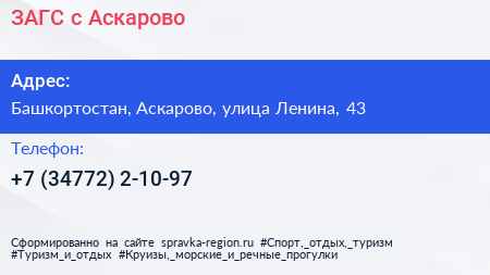 ЗАГС, с. Аскарово по адресу Башкортостан, Аскарово, улица Ленина, 43 в дальнейшем Организация, размещена в следующих категориях: