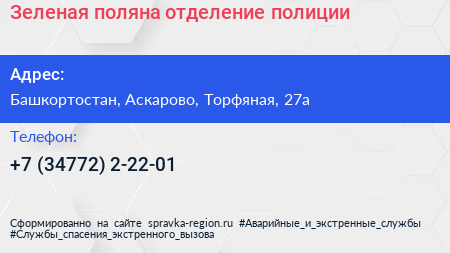 Зеленая поляна, отделение полиции по адресу Башкортостан, Аскарово, Торфяная, 27а в дальнейшем Организация, размещена в следующих категориях: