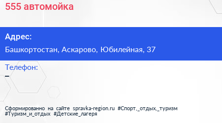 555, автомойка по адресу Башкортостан, Аскарово, Юбилейная, 37 в дальнейшем Организация, размещена в следующих категориях: