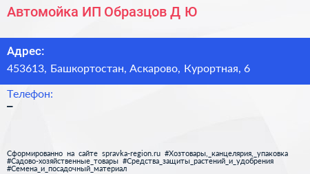Автомойка, ИП Образцов Д.Ю. по адресу 453613, Башкортостан, Аскарово, Курортная, 6 в дальнейшем Организация, размещена в следующих категориях: