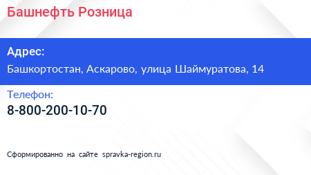Башнефть-Розница по адресу Башкортостан, Аскарово, улица Шаймуратова, 14 в дальнейшем Организация, размещена в следующих категориях: