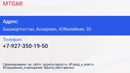 MTCAR по адресу Башкортостан, Аскарово, Юбилейная, 35 в дальнейшем Организация, размещена в следующих категориях: