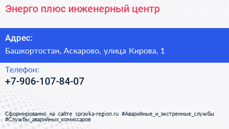 Энерго-плюс, инженерный центр по адресу Башкортостан, Аскарово, улица Кирова, 1 в дальнейшем Организация, размещена в следующих категориях: