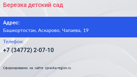 Березка, детский сад по адресу Башкортостан, Аскарово, Чапаева, 19 в дальнейшем Организация, размещена в следующих категориях:
