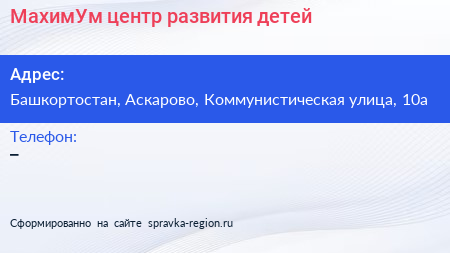 MaxимУм, центр развития детей по адресу Башкортостан, Аскарово, Коммунистическая улица, 10а в дальнейшем Организация, размещена в следующих категориях: