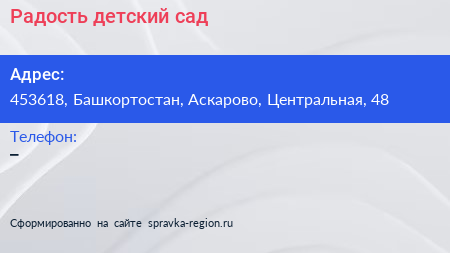 Радость, детский сад по адресу 453618, Башкортостан, Аскарово, Центральная, 48 в дальнейшем Организация, размещена в следующих категориях:
