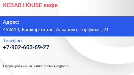 KEBAB HOUSE, кафе по адресу 453613, Башкортостан, Аскарово, Торфяная, 21 в дальнейшем Организация, размещена в следующих категориях: