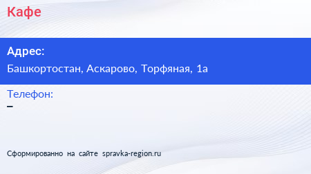 Кафе по адресу Башкортостан, Аскарово, Торфяная, 1а в дальнейшем Организация, размещена в следующих категориях: