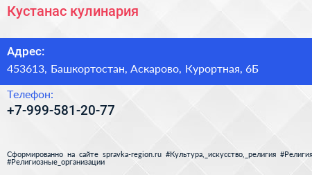 Кустанас, кулинария по адресу 453613, Башкортостан, Аскарово, Курортная, 6Б в дальнейшем Организация, размещена в следующих категориях: