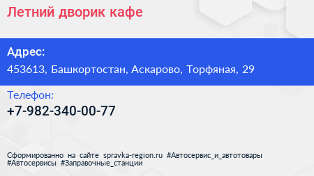 Летний дворик, кафе по адресу 453613, Башкортостан, Аскарово, Торфяная, 29 в дальнейшем Организация, размещена в следующих категориях: