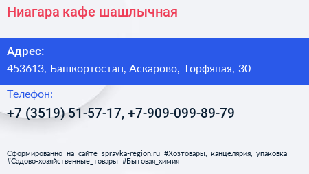 Ниагара, кафе-шашлычная по адресу 453613, Башкортостан, Аскарово, Торфяная, 30 в дальнейшем Организация, размещена в следующих категориях: