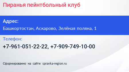 Пиранья, пейнтбольный клуб по адресу Башкортостан, Аскарово, Зелёная поляна, 1 в дальнейшем Организация, размещена в следующих категориях: