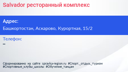 Salvador, ресторанный комплекс по адресу Башкортостан, Аскарово, Курортная, 15/2 в дальнейшем Организация, размещена в следующих категориях: