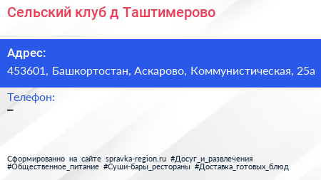 Сельский клуб, д. Таштимерово по адресу 453601, Башкортостан, Аскарово, Коммунистическая, 25а в дальнейшем Организация, размещена в следующих категориях: