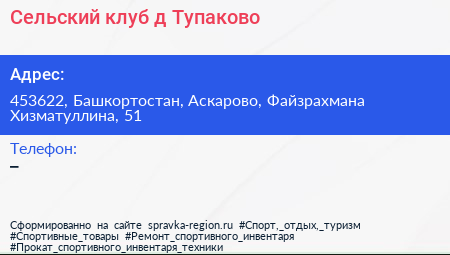 Сельский клуб, д. Тупаково по адресу 453622, Башкортостан, Аскарово, Файзрахмана Хизматуллина, 51 в дальнейшем Организация, размещена в следующих категориях: