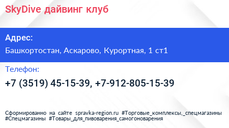 SkyDive, дайвинг-клуб по адресу Башкортостан, Аскарово, Курортная, 1 ст1 в дальнейшем Организация, размещена в следующих категориях:
