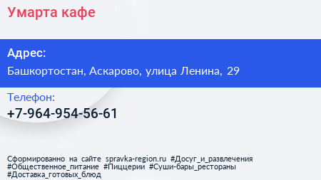Умарта, кафе по адресу Башкортостан, Аскарово, улица Ленина, 29 в дальнейшем Организация, размещена в следующих категориях: