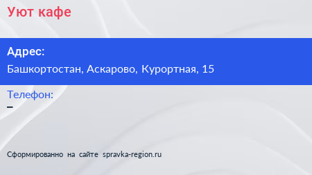 Уют, кафе по адресу Башкортостан, Аскарово, Курортная, 15 в дальнейшем Организация, размещена в следующих категориях: