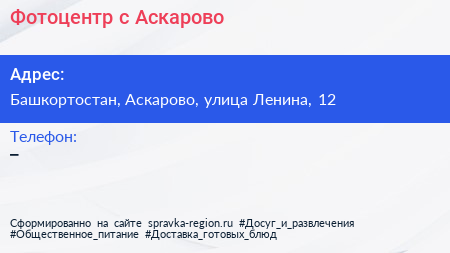 Фотоцентр, с. Аскарово по адресу Башкортостан, Аскарово, улица Ленина, 12 в дальнейшем Организация, размещена в следующих категориях: