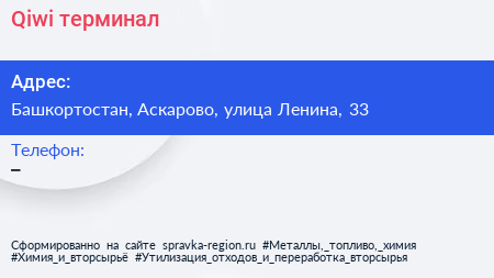 Qiwi, терминал по адресу Башкортостан, Аскарово, улица Ленина, 33 в дальнейшем Организация, размещена в следующих категориях: