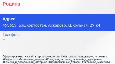 Родина по адресу 453613, Башкортостан, Аскарово, Школьная, 29 к4 в дальнейшем Организация, размещена в следующих категориях: