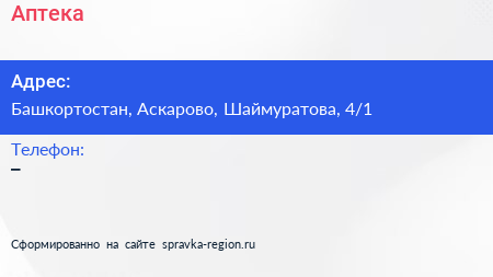 Аптека по адресу Башкортостан, Аскарово, Шаймуратова, 4/1 в дальнейшем Организация, размещена в следующих категориях: