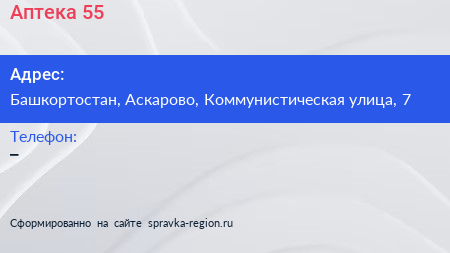 Аптека №55 по адресу Башкортостан, Аскарово, Коммунистическая улица, 7 в дальнейшем Организация, размещена в следующих категориях: