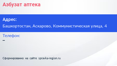 Азбузат, аптека по адресу Башкортостан, Аскарово, Коммунистическая улица, 4 в дальнейшем Организация, размещена в следующих категориях: