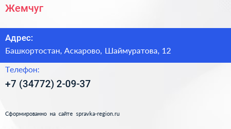 Жемчуг по адресу Башкортостан, Аскарово, Шаймуратова, 12 в дальнейшем Организация, размещена в следующих категориях:
