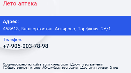 Лето, аптека по адресу 453613, Башкортостан, Аскарово, Торфяная, 26/1 в дальнейшем Организация, размещена в следующих категориях: