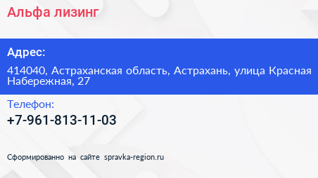 Альфа-лизинг по адресу 414040, Астраханская область, Астрахань, улица Красная Набережная, 27 в дальнейшем Организация, размещена в следующих категориях: