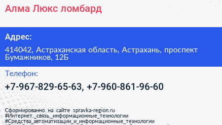 Алма-Люкс, ломбард по адресу 414042, Астраханская область, Астрахань, проспект Бумажников, 12Б в дальнейшем Организация, размещена в следующих категориях: