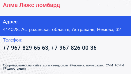 Алма-Люкс, ломбард по адресу 414028, Астраханская область, Астрахань, Немова, 32 в дальнейшем Организация, размещена в следующих категориях: