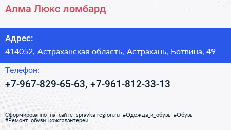 Алма-Люкс, ломбард по адресу 414052, Астраханская область, Астрахань, Ботвина, 49 в дальнейшем Организация, размещена в следующих категориях: