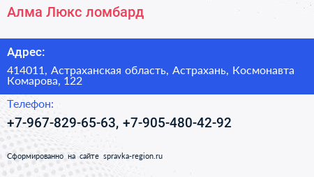 Алма-Люкс, ломбард по адресу 414011, Астраханская область, Астрахань, Космонавта Комарова, 122 в дальнейшем Организация, размещена в следующих категориях: