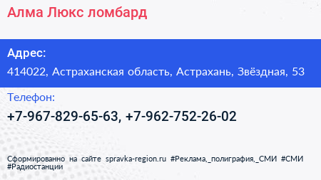 Алма-Люкс, ломбард по адресу 414022, Астраханская область, Астрахань, Звёздная, 53 в дальнейшем Организация, размещена в следующих категориях: