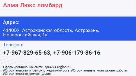 Алма-Люкс, ломбард по адресу 414009, Астраханская область, Астрахань, Новороссийская, 1а в дальнейшем Организация, размещена в следующих категориях: