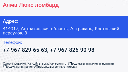 Алма-Люкс, ломбард по адресу 414017, Астраханская область, Астрахань, Ростовский переулок, 8 в дальнейшем Организация, размещена в следующих категориях: