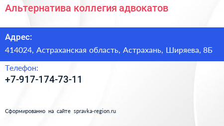 Альтернатива, коллегия адвокатов по адресу 414024, Астраханская область, Астрахань, Ширяева, 8Б в дальнейшем Организация, размещена в следующих категориях: