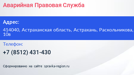 Аварийная Правовая Служба по адресу 414040, Астраханская область, Астрахань, Раскольникова, 10в в дальнейшем Организация, размещена в следующих категориях: